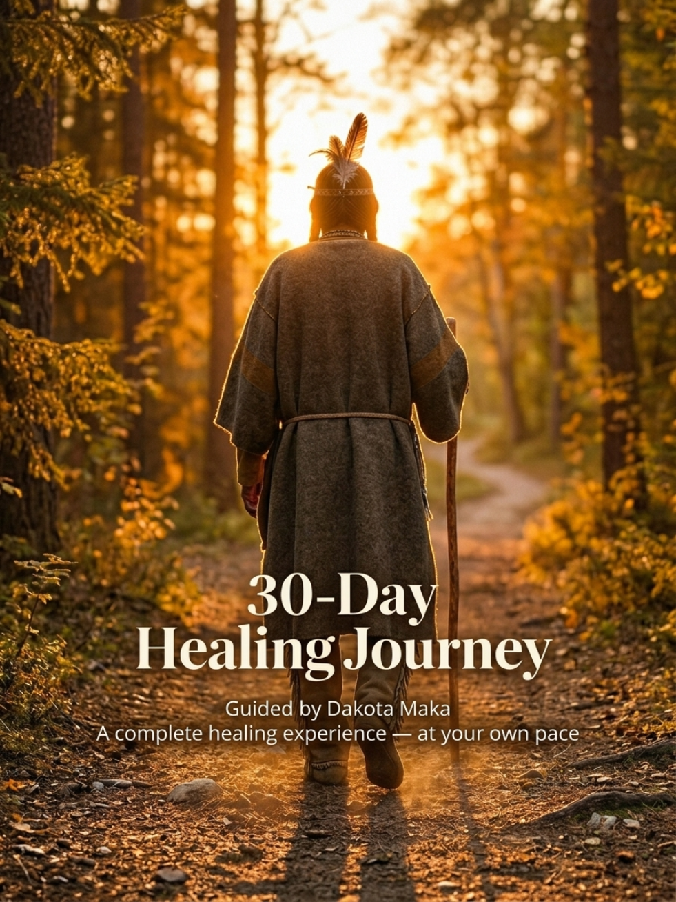 A 30-day guided journey back to yourself β daily lessons, meditation, breathwork, food rituals, and weekly video teachings by Dakota Maka. At your own pace, in your own time.